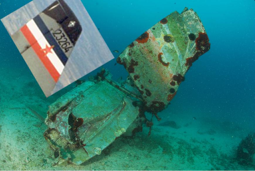 Posebnu pažnju privlači rep aviona, na kojem se na okomitom stabilizatoru još uvijek dobro vidi jugoslavenska trobojka s crvenom zvijezdom. Nažalost, serijski broj koji je ključ za točno utvrđivanje identiteta aviona koji je bio crnom bojom ispisan iznad trobojke jedva se nazire i ne može se više sa sigurnošću pročitati.